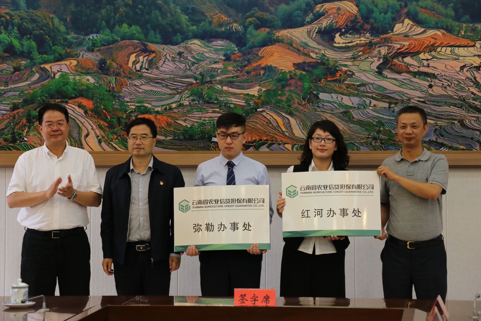8月21日上午云南省農(nóng)業(yè)信貸擔保有限公司與紅河州人民政府戰(zhàn)略合作協(xié)議簽訂暨公司紅河辦事處、彌勒辦事處授牌儀式在紅河州會堂正式舉行。州人民政府副州長常斌、公司董事長郭影、總經(jīng)理杜開波及紅河州各相關(guān)部門、各銀行金融機構(gòu)及各縣市區(qū)農(nóng)業(yè)、財政部門參加了會議。