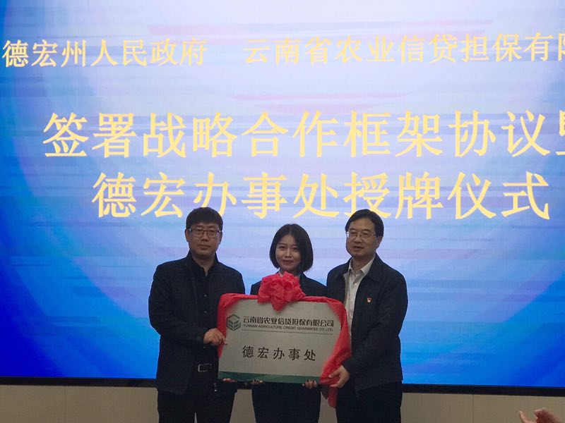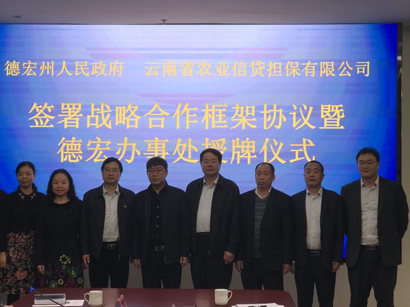 12月19日上午,德宏州人民政府、云南農(nóng)擔(dān)公司簽署戰(zhàn)略合作框架協(xié)議暨德宏辦事處授牌儀式在芒市會(huì)堂舉行。德宏州委常委、常務(wù)副州長(zhǎng)馬云峰,農(nóng)擔(dān)公司董事長(zhǎng)郭影、總經(jīng)理杜開(kāi)波、機(jī)構(gòu)部負(fù)責(zé)人蔡菲、德宏州財(cái)政局、農(nóng)業(yè)局、人行德宏支行、德宏銀監(jiān)分局、農(nóng)行德宏分行、省聯(lián)社德宏辦、各縣市政府等相關(guān)單位參加會(huì)議。