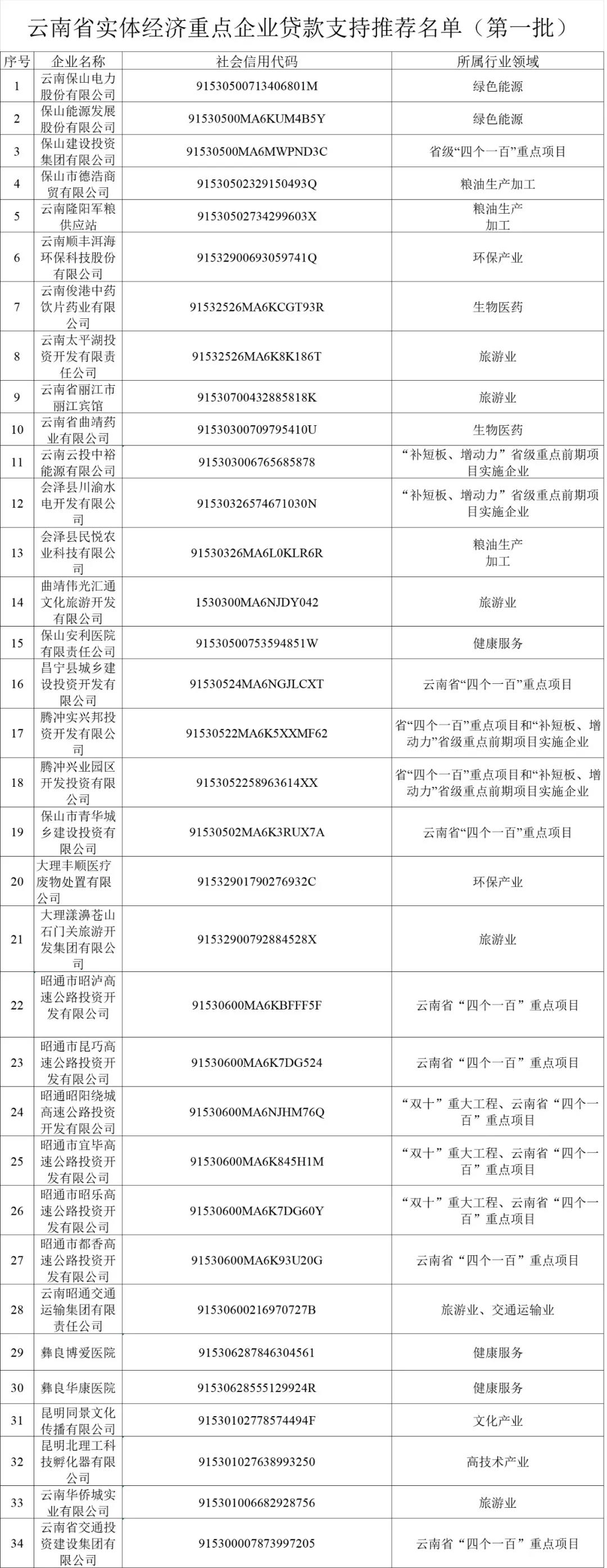 根據(jù)《云南省人民政府印發(fā)關(guān)于支持實體經(jīng)濟發(fā)展的若干措施的通知》、《云南省發(fā)展和改革委員會關(guān)于貫徹落實支持實體經(jīng)濟發(fā)展的若干措施實行貸款企業(yè)名單制管理有關(guān)事項的通知》要求,現(xiàn)將省發(fā)展改革委推送至省工業(yè)和信息化廳、省財政廳、省農(nóng)業(yè)農(nóng)村廳、省商務(wù)廳、省文化和旅游廳、省地方金融監(jiān)管局、省稅務(wù)局、人民銀行昆明中心支行、云南銀保監(jiān)局、云南證監(jiān)局,以及抄送相關(guān)金融機構(gòu)的《云南省實體經(jīng)濟重點企業(yè)貸款支持推薦名單》(第一批)予以公布。