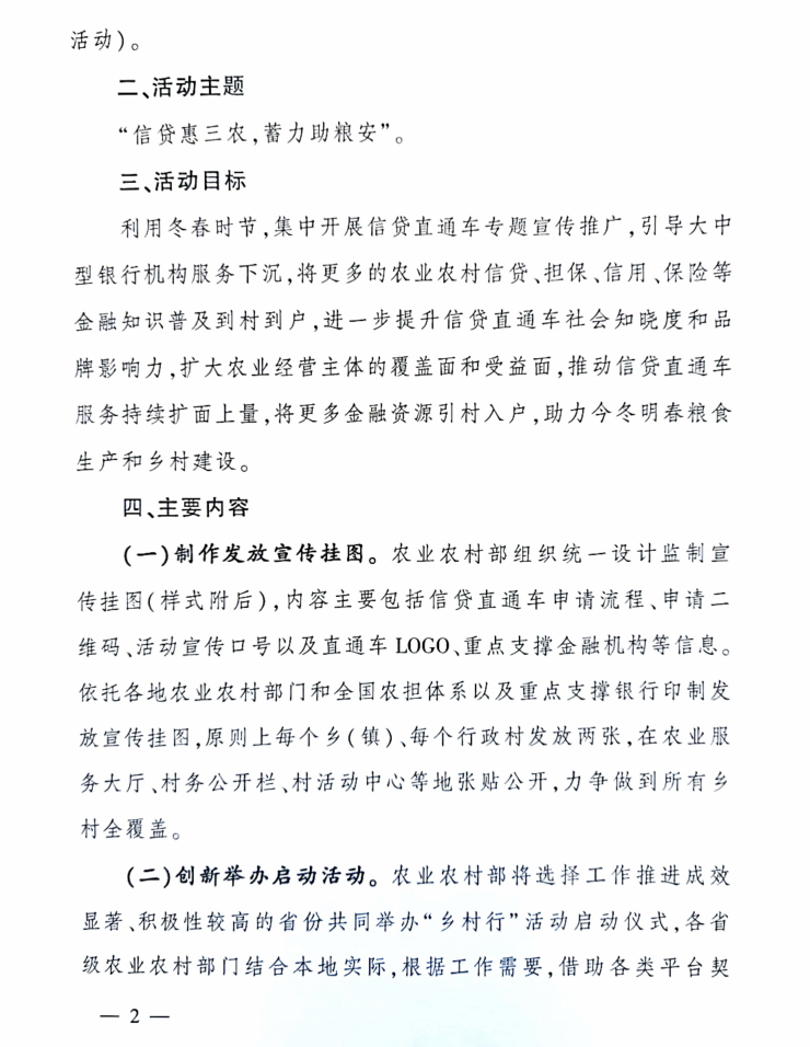 農(nóng)業(yè)農(nóng)村部印發(fā)通知開展農(nóng)業(yè)經(jīng)營主體信貸直通車“鄉(xiāng)村行”活動